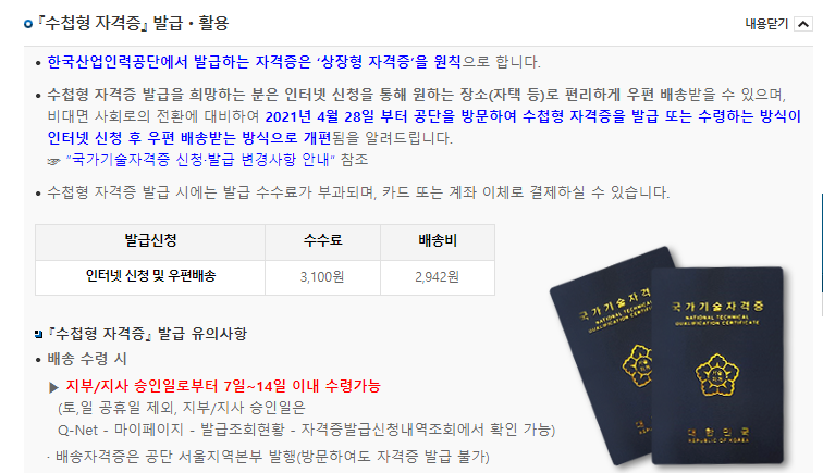 그리고 이제는 기본은 상장형으로 제공되지만 수첩형 자격증이 가지고 싶어서 인터넷으로 신청을 했습니다! 상장형보다는 수첩형이 좋아보이잖아요?😉 딱 일주일 후에 수첩형 자격증을 받았습니다.